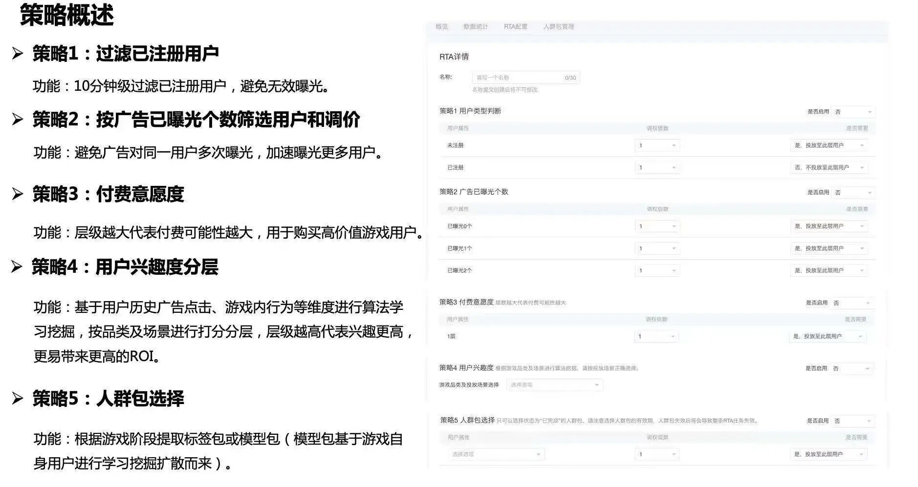 RTA(Realtime API)投放模式,是广告平台仅开放给有技术能力和数据能力的头部广告主,在保障双方数据安全的同时,实现实时个性化投放需求的特殊能力。微信小游戏提供平台统一服务,帮助开发者接入RTA能力,并给予开发者不同类型用户ROI对比,支持开发者针对不同用户分层设置筛选及出价策略。