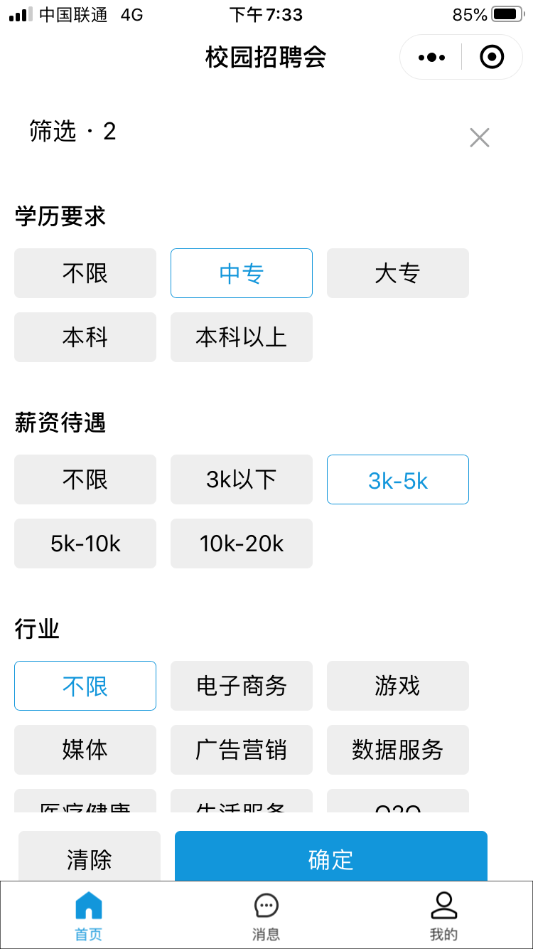 该项目的宗旨是以广东石油化工学院为起始,以小程序为运营主体的校园招聘平台!是一个专门为“大学生校园招聘会”服务的小程序。该小程序可以分为三大个部分,一个是企业部分,一个是毕业生部分,另一部分是企业与毕业生线上交流部分。