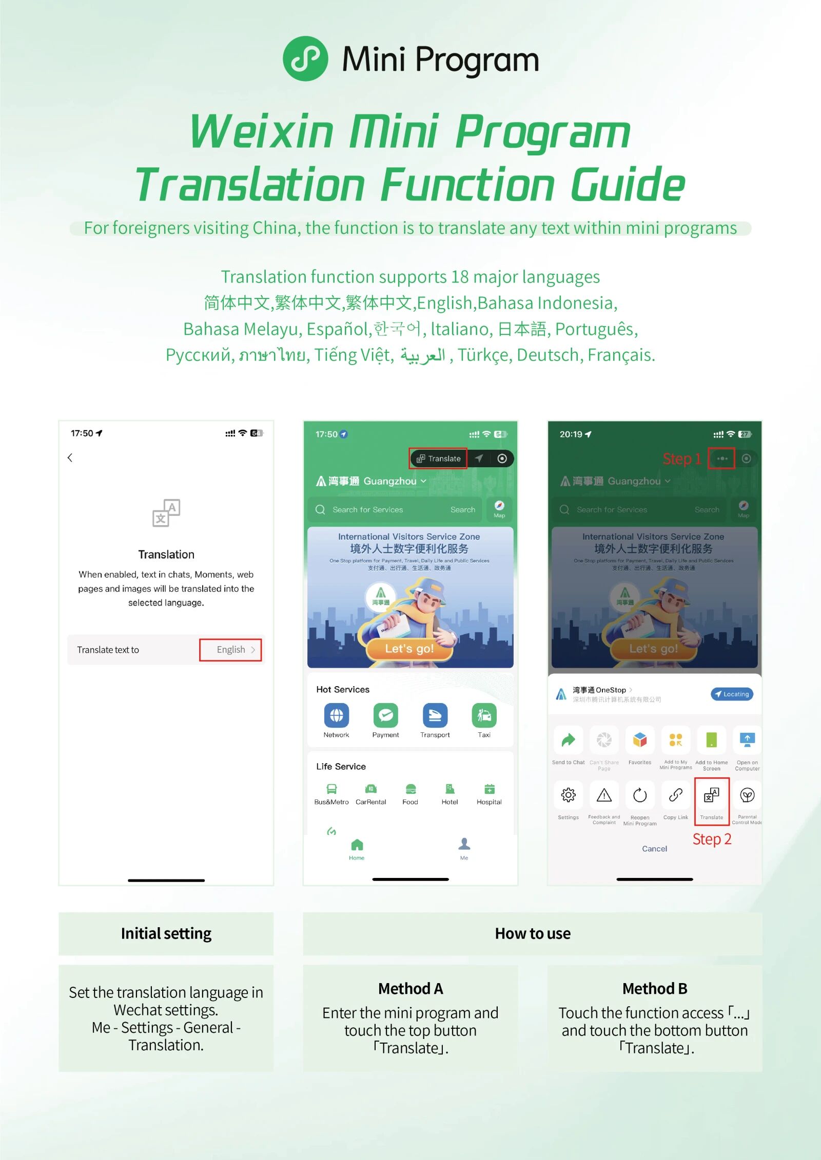 - 开发者可通过wx.onOnUserTriggerTranslation监听用户触发小程序的翻译功能事件,动态将页面的核心内容进行多语言适配。wx.onOnUserTriggerTranslation(function listener) | 微信开放文档