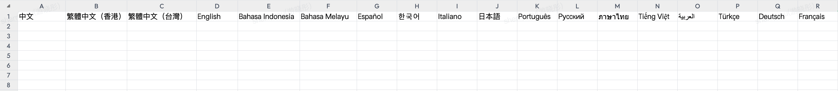 - 翻译词库Excel文件首列为小程序主语言,若小程序主语言为中文,则将中文放在A列;若小程序主语言为英文,则将英文放在A列,以此类推;