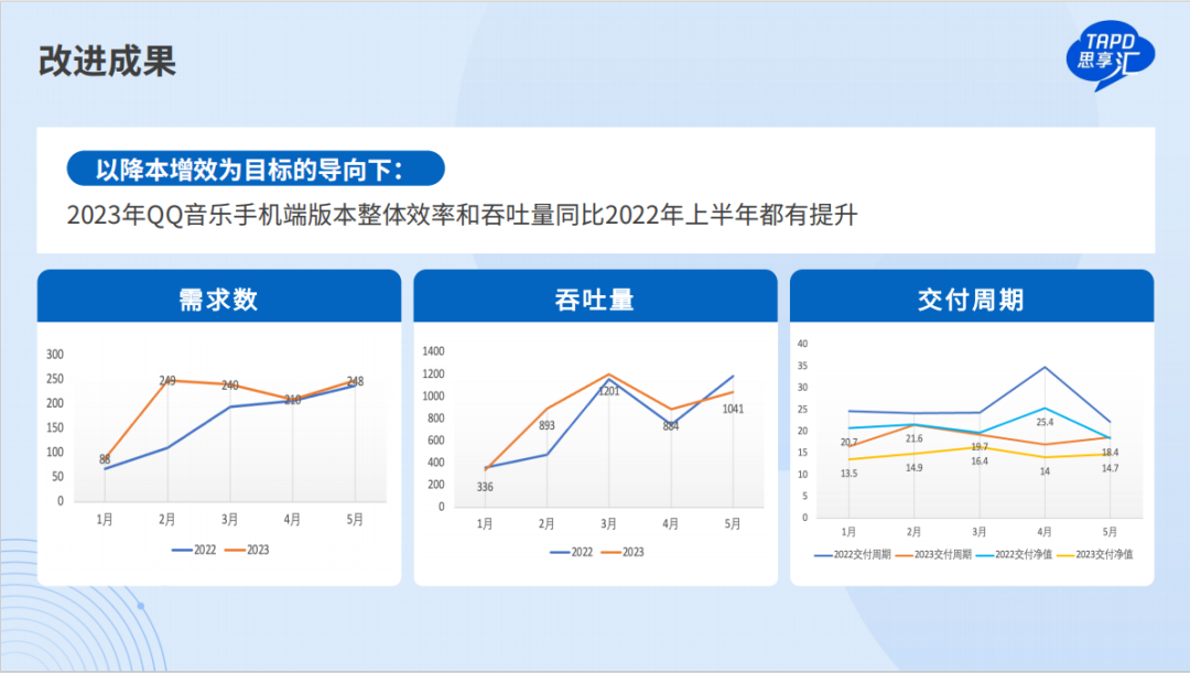 通过TAPD对需求全生命周期进行全流程管理,QQ音乐2023年上半年和2022年的上半年同比,交付周期和吞吐量都有明显提升。