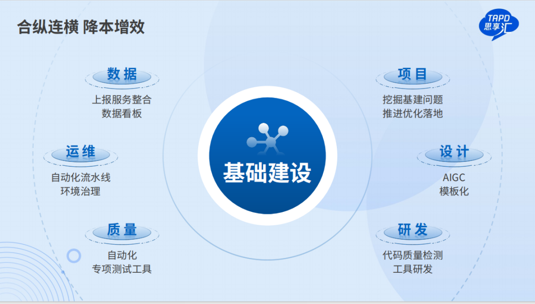 除了依靠管理模式和方法的优化来提高团队效率外,在基础建设方面,我们联合相关团队不断探索和改进,从项目、质量、研发、运维、设计、数据等不同角度,合纵连横,持续提升降本增效的效果。
