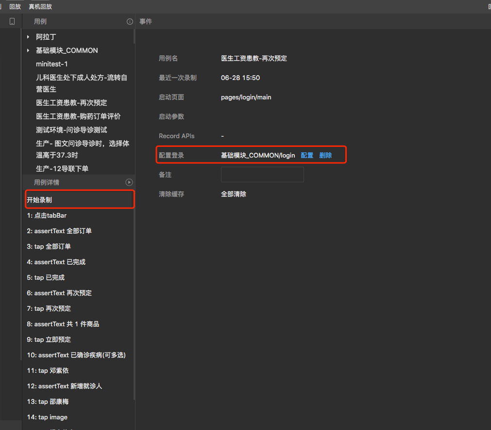 配置入口:点击开始录制,可以看到当前Case的说明,增加了配置登录项,可以选择配置和删除