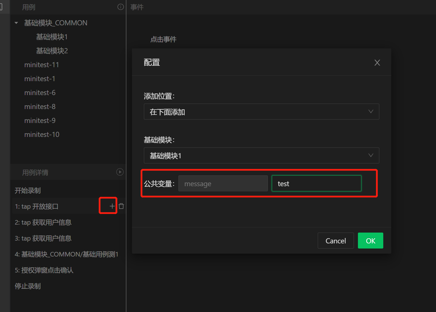 在真正录制业务Case过程中,可以在任意步骤插入基础用例。点击用例步骤旁的 “+” 号,选择要插入的基础模块即可