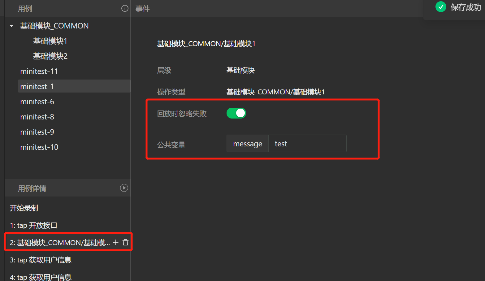 2、在具体业务录制时,可随时插入基础模块用例,如果传入公共变量,可以配置公共变量的值
