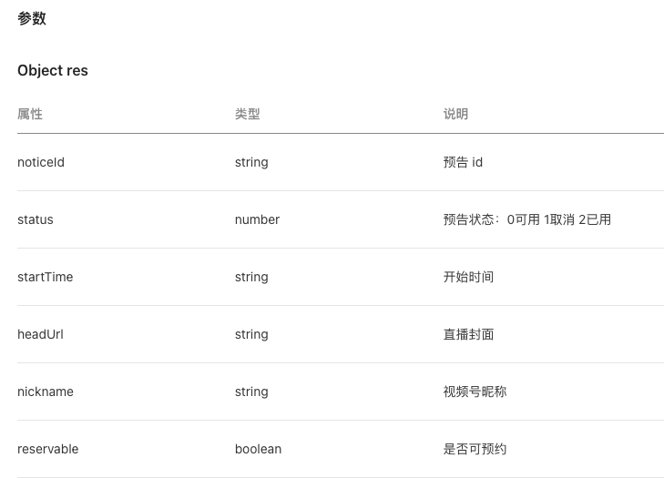 其中noticeId是用于后续预约预告用的,没什么可说的,比较让人疑惑的是status和reservable字段,你可能会将status理解成目前的预告状态,reservable理解成用户是否已预约,没毛病,笔者刚开始也是那么理解的,但真实调用后发现status只会存在0这种状态,如果预告被取消了或者已用,那直接就走到fail回调里面了。而reservable也不是是否已预约的意思,不管用户是否预约,该字段都是返回true。