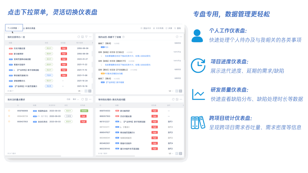 TAPD现已支持创建多个仪表盘, 你可以根据进度把控、质量管理、风险预警等不同场景的需要,为自己或团队配置多个专用仪表盘。专盘专用,让关键信息更加聚合,数据管理更加便捷。