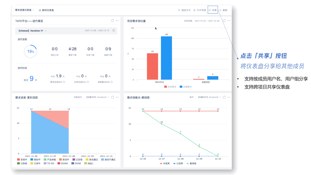 只需要点击「共享」按钮,就可以一键把仪表盘分享给你的团队成员,将项目进度和达成情况透明出来,让研发进度更加可视化。