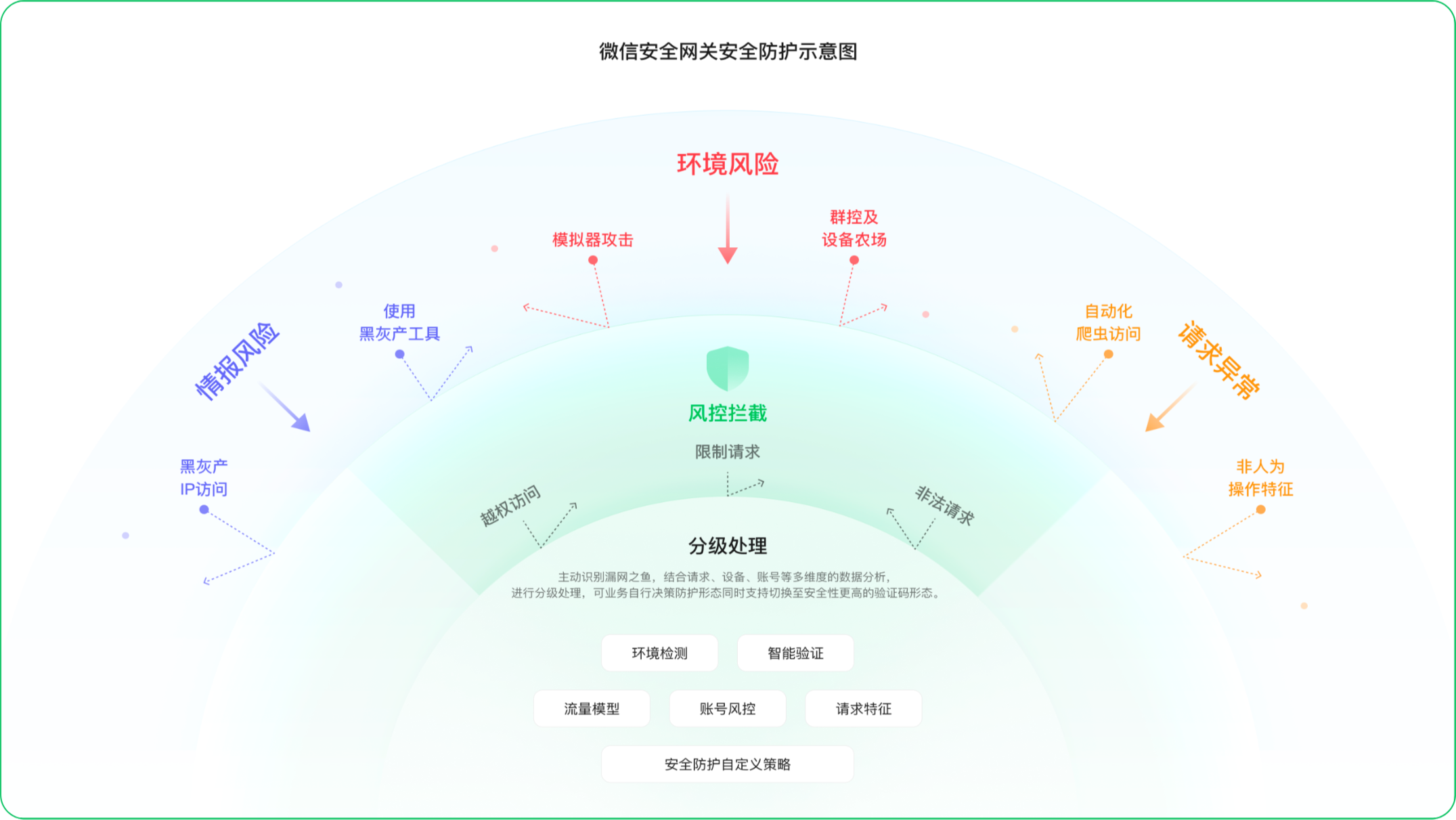 此外,微信网关还基于环境特征、用户操作行为、威胁情报等多维度数据进行智能分析,精准识别黑灰产流量,并对其进行拦截或标记处理。