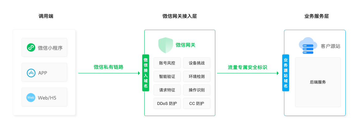 它提供了一个安全稳定的私有接入链路,从调用端(小程序、Web、APP 等)发起的请求直接走微信微信网关的私有协议,微信网关将异常请求过滤后,二次封装加密正常请求并将正常请求转发至后端服务源站。