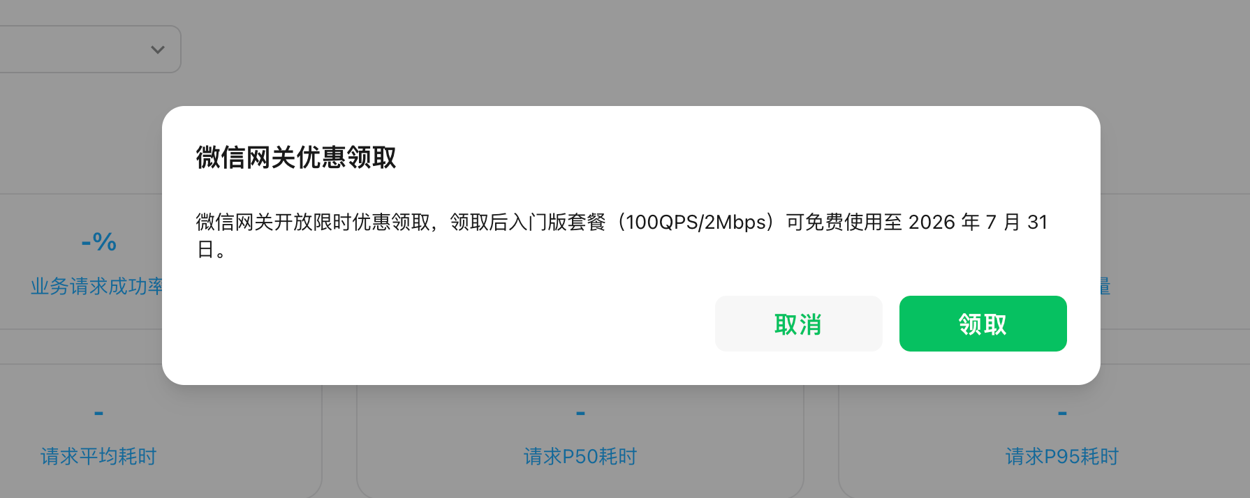 - 领取微信网关优惠,进入控制台后会弹窗领取优惠通知,点击领取即可。