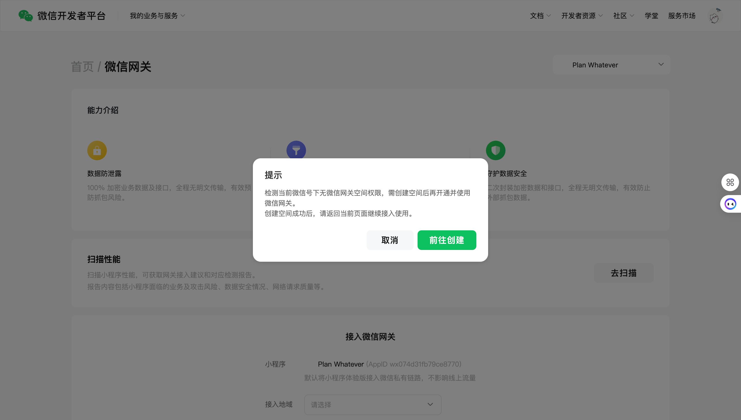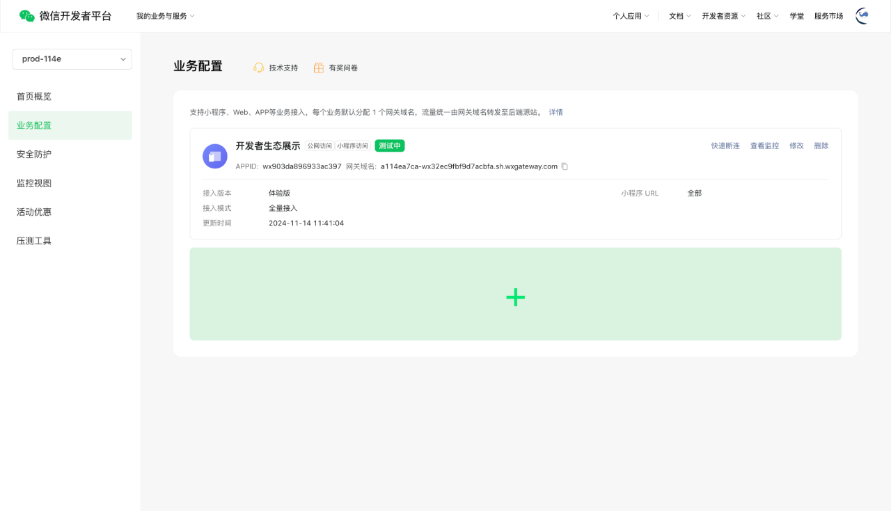 - 如当前微信号下已有微信网关空间且已有微信网关,平台将默认将小程序接入到该微信网关下;