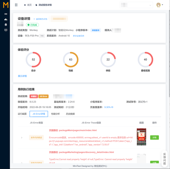 下图展示了某个项目的 Monkey 测试报告的样例,可以看出本次测试发现小程序体验版本中的一些 JsError 的报错情况,便于快速 debug。