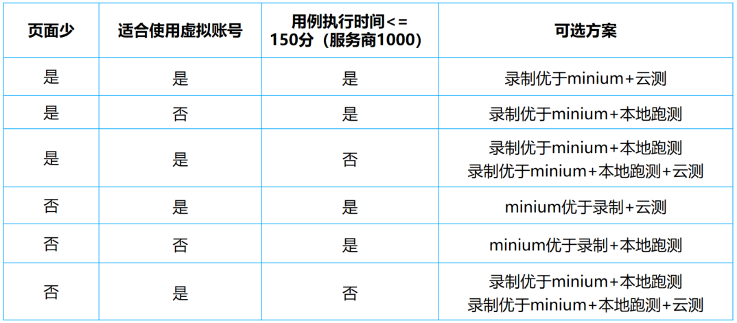 页面多少决定选择录制还是minium,是否适用虚拟账号决定能否用云测,用例执行时间决定本地还是云测运行更方便(当然全部跑本地也行啊~)