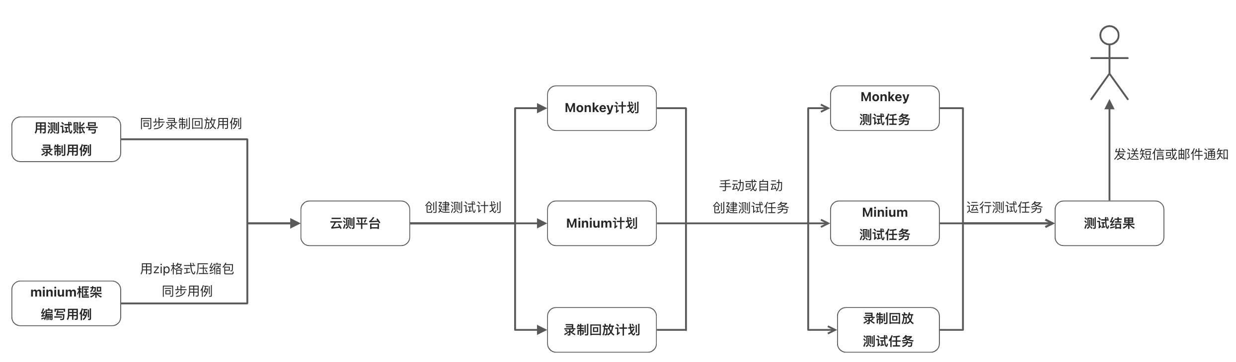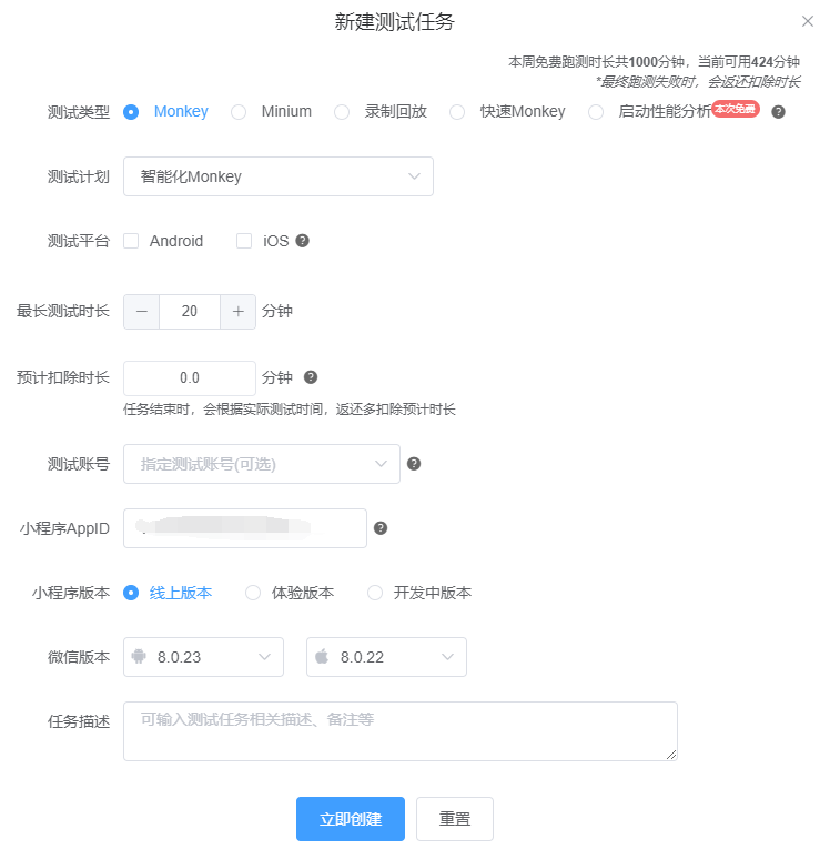 云测平台可以基于你上传的用例创建相应的测试计划,然后选择小程序不同版本(开发版、体验版、线上版)、手机系统类型(安卓和ios)、测试账号等根据测试计划创建任务,跑测完毕可以通过短信和邮件通知测试结果。