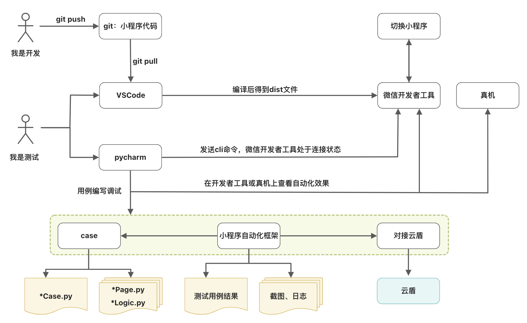 要进行Minium用例编写,前提是搭建好小程序开发环境,这个可以询问自己项目组的前端开发。下图是以我们组内实践为例画的流程图,让大家对如何运行Minium脚本有个概念。图内的切换小程序,若你们不是第三方服务商则不涉及;云盾是我们公司的用例管理执行平台,同理也可以替换为你们自己的用例平台,将跑测完的结果同步到用例平台。