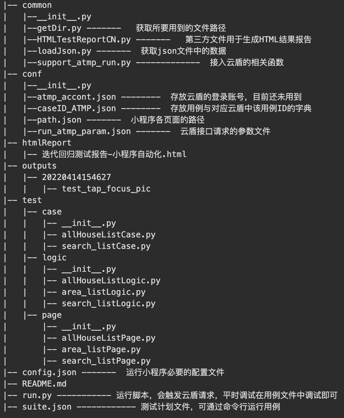 - AllHouseListCase继承minium.MiniTest类,因为是固定在该页面执行用例,每个组件操作的前置步骤都是先进入该页面,所以在setUp里面添加进入该页面的前置操作(举一反三,其它页面的case的前置操作也是如此)。