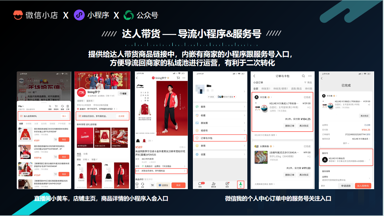 - 达人带货,沉淀达人粉丝回到商家私域。以前品牌商家找达人带货,提供坑位费、高佣金及广告费,只能是一次性卖货,无法再次触达购买用户。现在可通过订单详情页的服务号入口及商品详情的入会入口引流购买用户关注商家服务号或小程序,后期可反复触达进行运营转化。