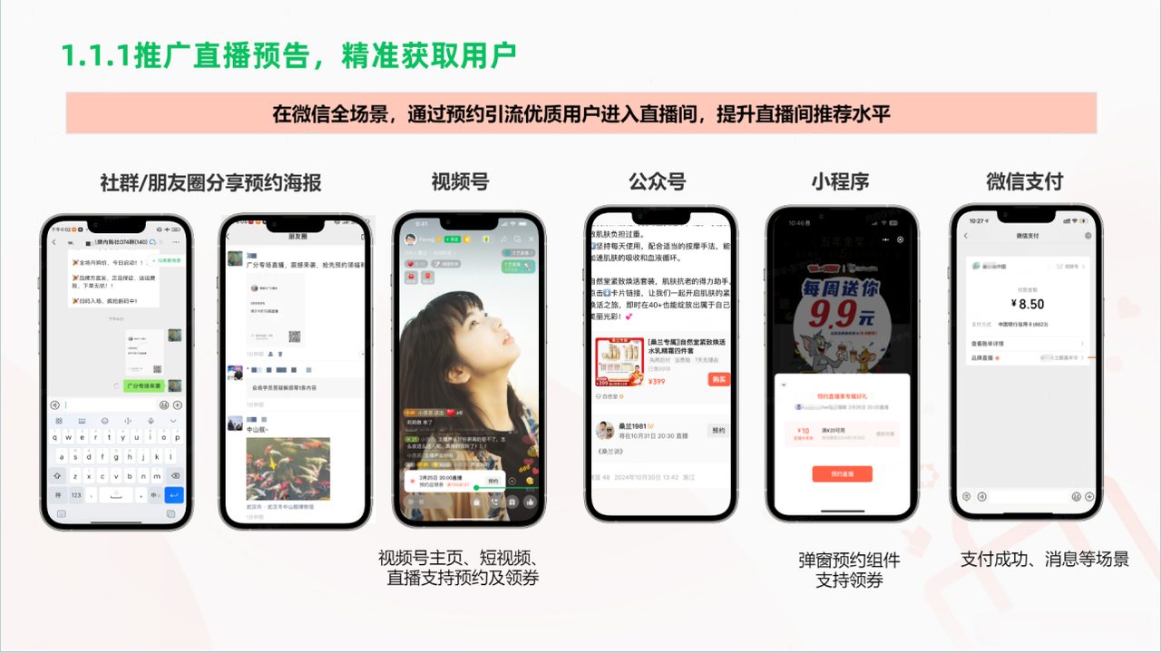 - 利用服务号及小程序的作为呈现直播状态入口,引导粉丝用户进入直播间观看。视频号直播时,服务号与小程序会呈现多个直播入口,可直播引流进入直播间。直播时,服务号会推送开播通知,服务号顶部会展现直播中的状态入口,同时也可以推送文章,文章嵌入直播组件,方便粉丝预约直播或直接点击进入直播间观看。小程序则会在首页以挂件的方式展现直播入口,商品详情页也可以有直播挂件入口,同时也可以通过推送模板消息给用户提醒直播间开播了。