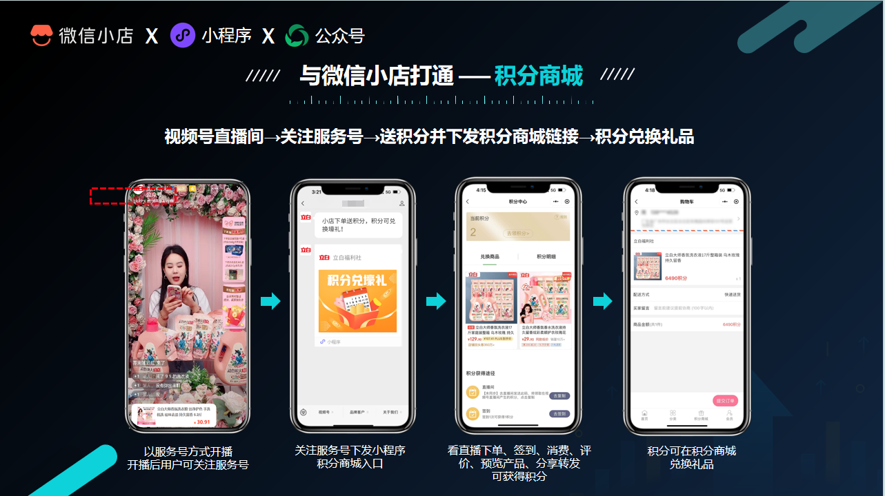 - 利用私域裂变拓新并作直播预约,反哺回直播间获得推荐流量。视频号商家应该都知道,平台自然流较少,而付费广告流量属于一波流,无法存留复用,导致广告成本越来越高。因此,积累私域用户池复用提升复购就成了大家的共识。如果商家有了私域,就可以通过小程序提供的服务能力做一些营销活动去裂变拉新用户,例如抽奖、集赞、优惠券等等,扩大私域用户池。在视频号直播时就可以在私域引流回到直播间再进行促单转化,如参与抽奖需要预约直播间,观看直播,点赞分享转发可以获得积分,积分可兑换礼品。通过这些方式引流到直播间的用户更精准,成交转化率也会更高,直播的数据指标会更好,那就能获得更多平台的流量推荐。平台还有私域扶持政策,从小程序引流至直播间的场景刚好是符合扶持政策的要求,这样就能获得更多的流量券扶持,可用于直播间的广告投放。