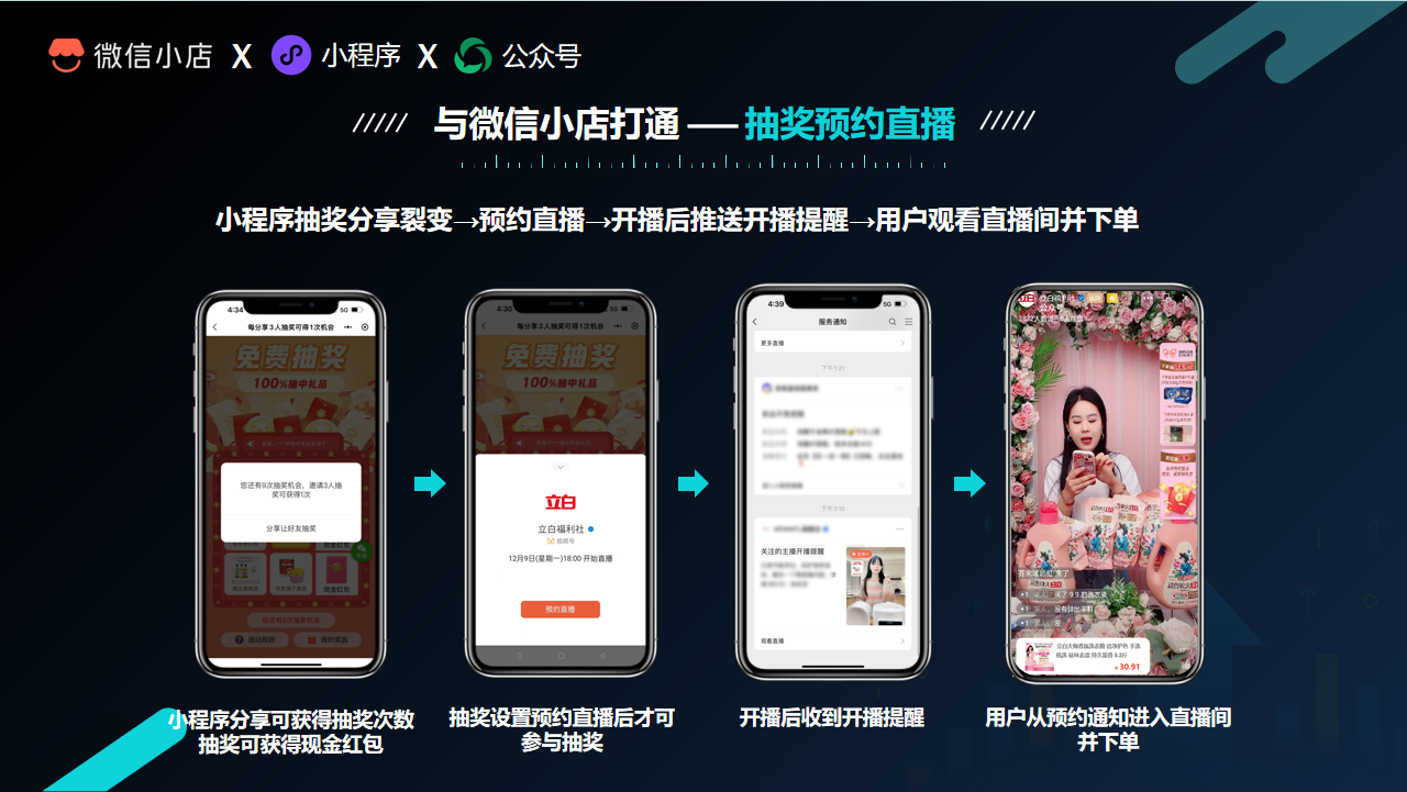 在微信公开课上,推出了微信小程序与微信小店打通的能力。具体来说,就是在小程序里查看商品和交易都可以内嵌微信小店的商品组件,最终在微信小店内完成浏览产品和下单交易。商品和支付都在微信小店里面完成。这样小程序就可以脱离商品和交易环节,专注于做营销玩法或活动裂变。
