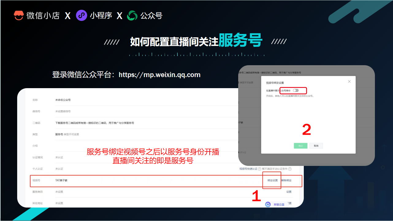 - 视频号关联服务号,引流直播间观众沉淀到服务号。在服务号中开启在视频号直播中展现服务号身份的配置,那么在视频号直播时,观众关注视频号就能自动关注到服务号。服务号可以配置自动下发信息(文案+图片/小程序卡片),引导用户进入小程序。勾子可以是点击下方卡片参与免费抽奖(百分百中奖,如给一些优惠券之类或小现金红包),也可以是点击卡片成为会员获取会员权益(如12张每月优惠券),亦或是查询会员积分可进行积分礼品兑换等等。通过这个方式可以把直播间观众引流沉淀到服务号跟小程序的私域池中进行精细化运营。