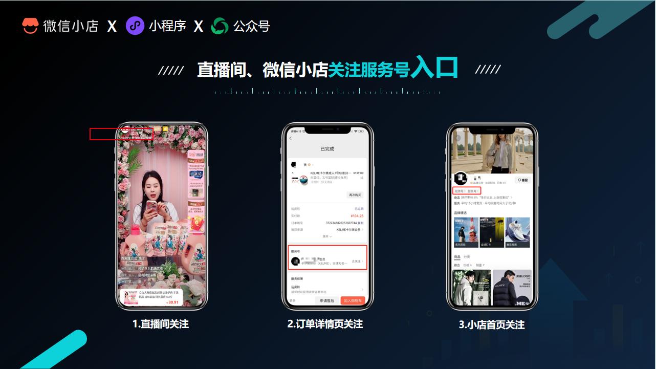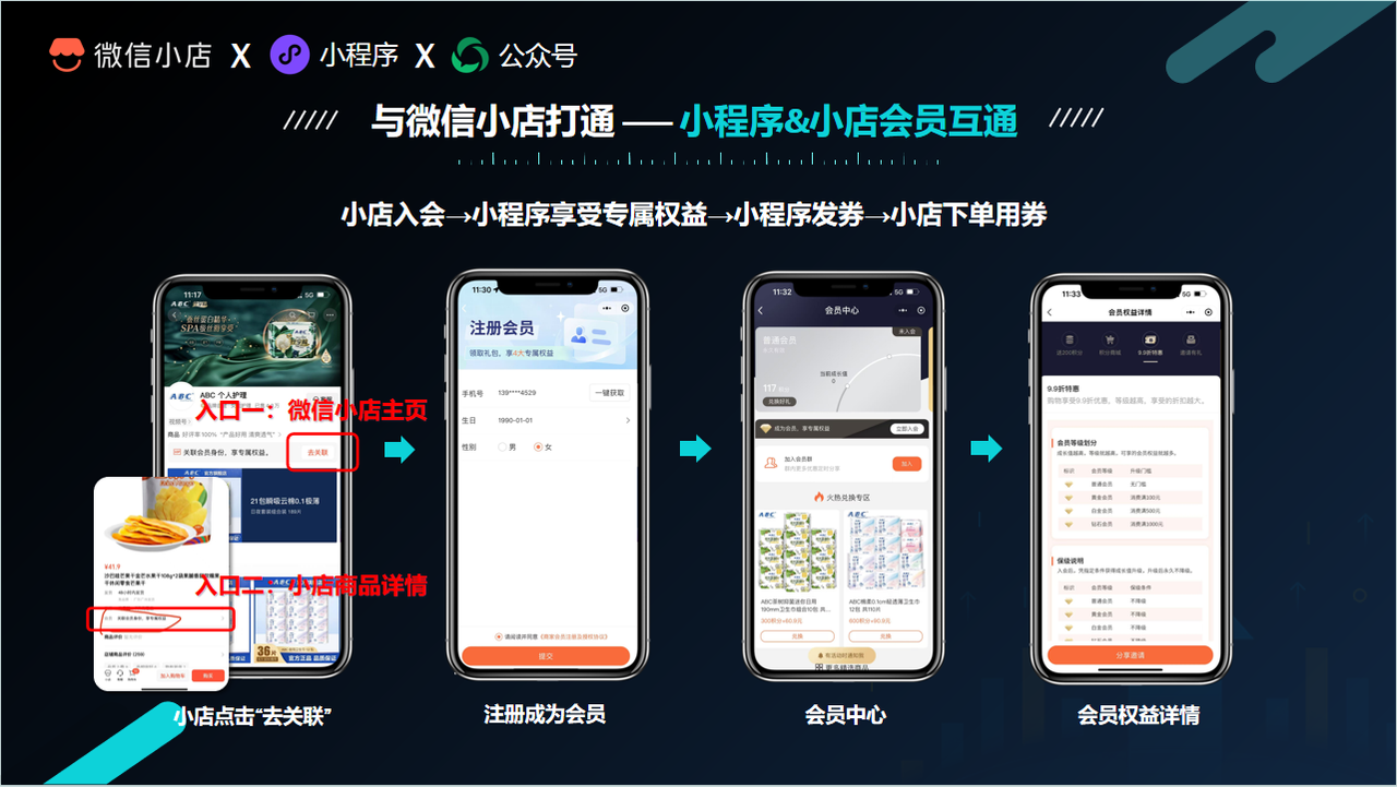 - 小店提供服务号/小程序入口。如小店主页的服务号入口,小店订单详情的服务号关注入口,小店首页的小程序入会会员入口,小店商品详情页的小程序入会会员入口。利用这些入口可以把用户引导到服务号跟小程序,后期持续运营进行转化,提升二次销售复购。