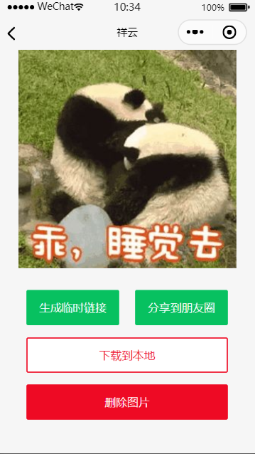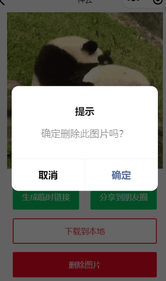 最后就是核心功能,照片的存储转发功能。基于vant提供的button等组件:1.使用小程序的自带api和qrcode云函数生成对应的链接和qrcode,2.下载到本地,3.使用callback云函数删除照片,并退回原界面。