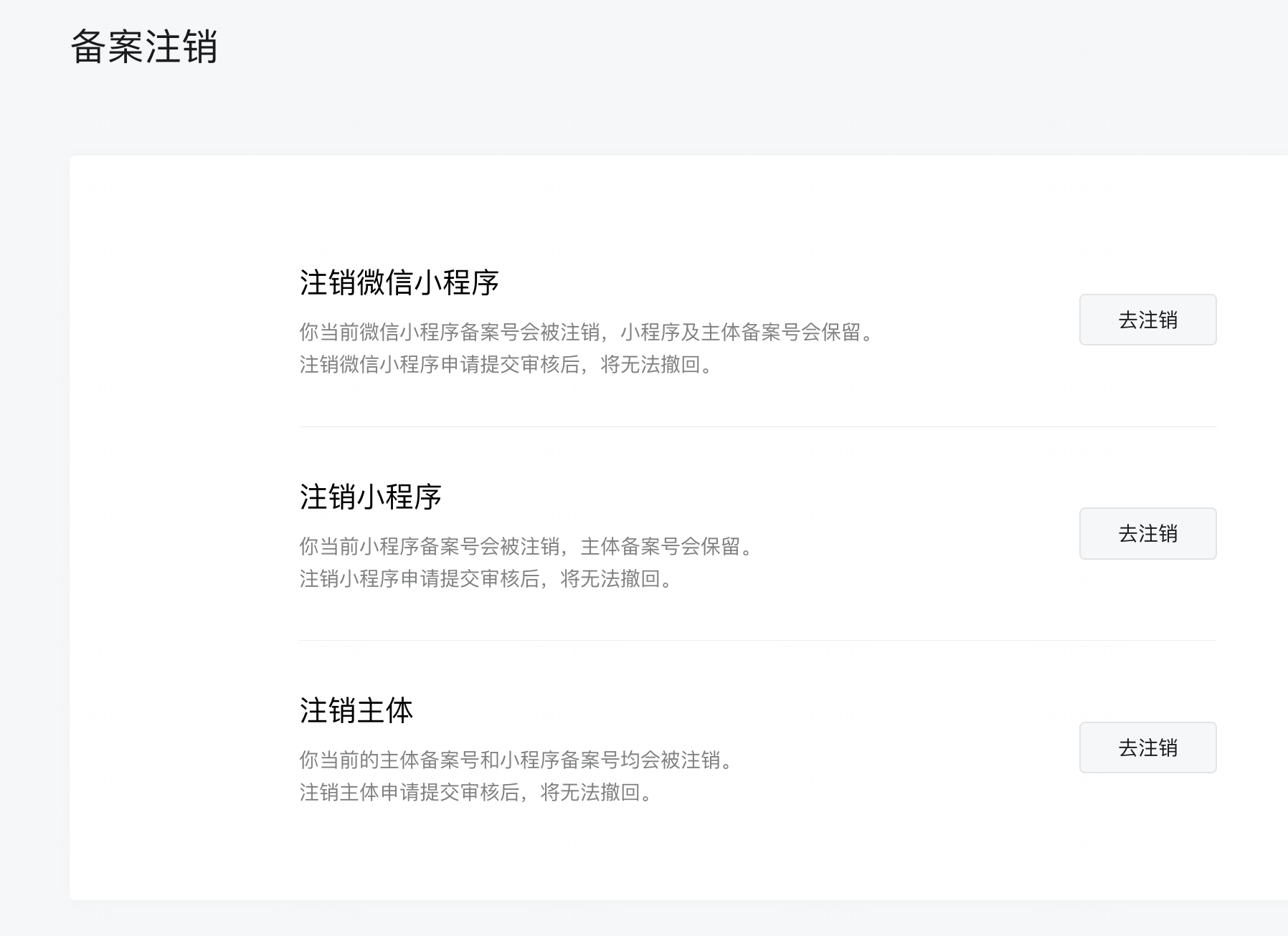 (2)因注销是不可逆转的操作,建议开发者自行确认注销需求,避免造成不必要的损失。注销备案类型请参考:https://developers.weixin.qq.com/miniprogram/product/record/record_faq.html#%E5%8D%81%E5%9B%9B%E3%80%81%E6%B3%A8%E9%94%80%E5%A4%87%E6%A1%88%E7%9B%B8%E5%85%B3
