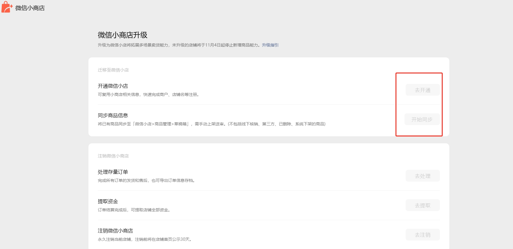 点击升级后,去开通按钮并没有亮起,我开通了新的微信小店后,同步按钮也没有亮起