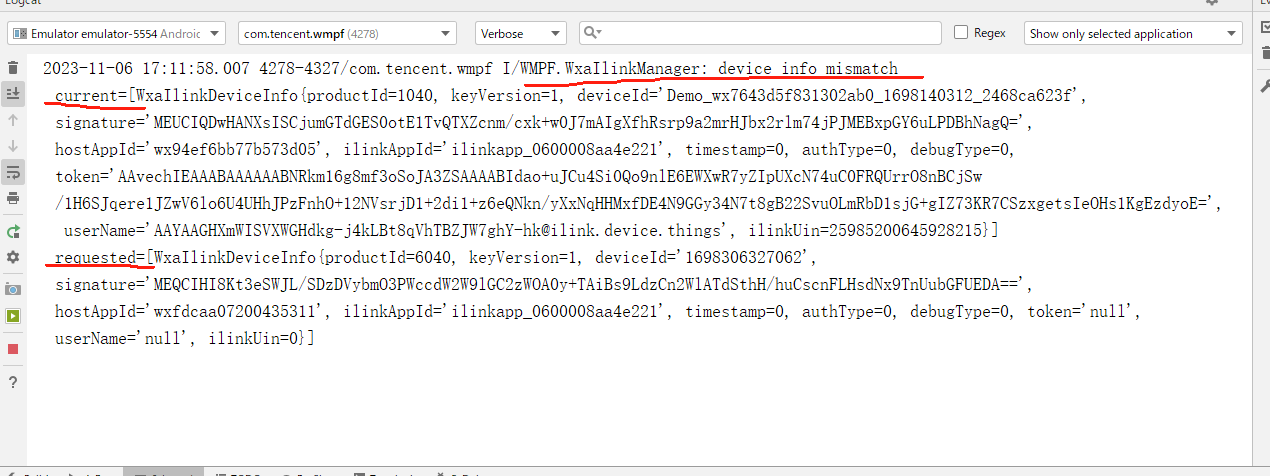 这是WMPF服务端看到的日志 设备信息不匹配 这个current里面的信息是什么东西 我的客户端中没有这些信息