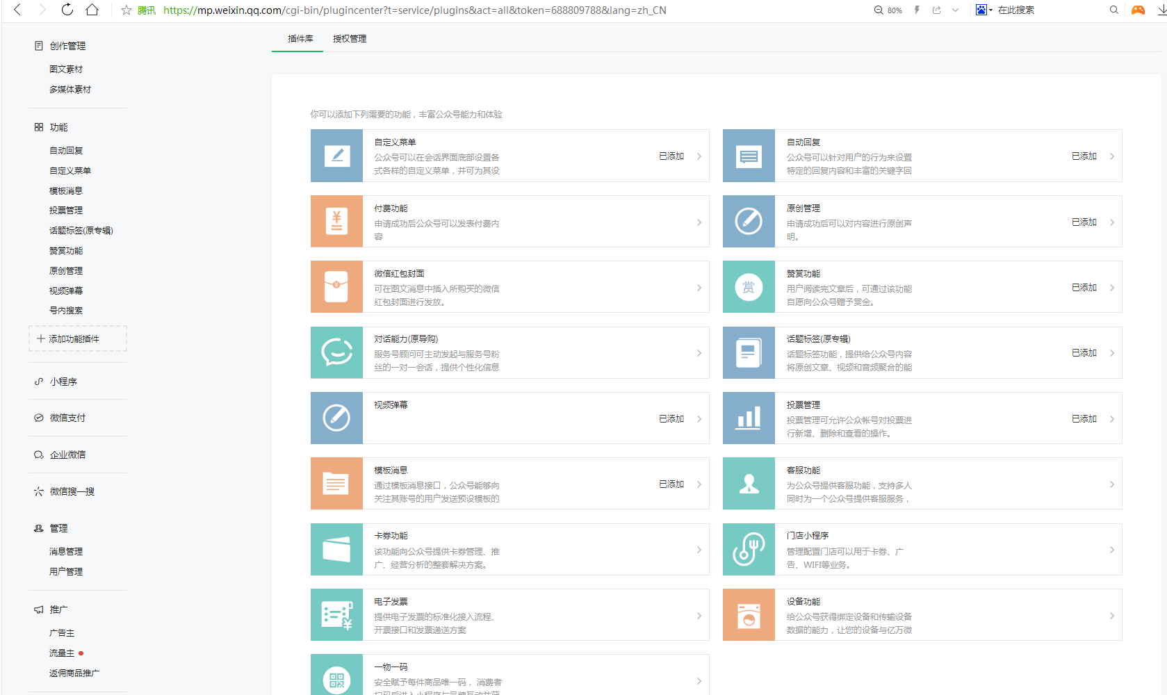 在公众后后台的管理界面中的 添加功能插件中,没有 订阅通知 开通的按钮。
