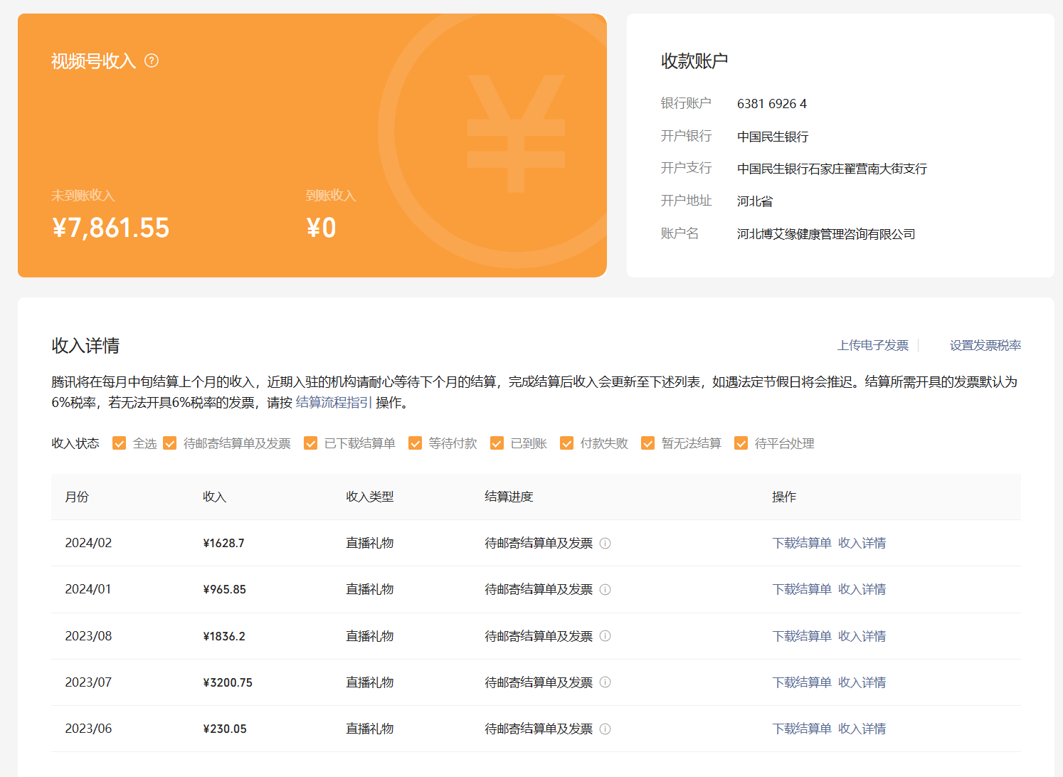2023年和2024年我们是以企业认证进行的直播,期间有7861.55元的直播收入,没有进行过提现。