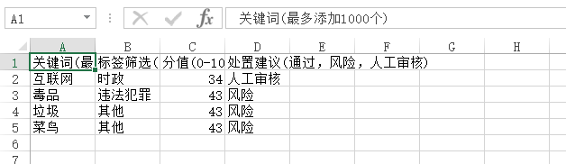 开发者登录小程序管理后台,可在【开发→开发管理→安全中心→内容风控】进行自定义关键词的配置。具体可操作添加相应关键词的标签、分值和处置建议,接口将识别包含自定义关键词的违规内容,可以更灵活地满足开发者业务需求。