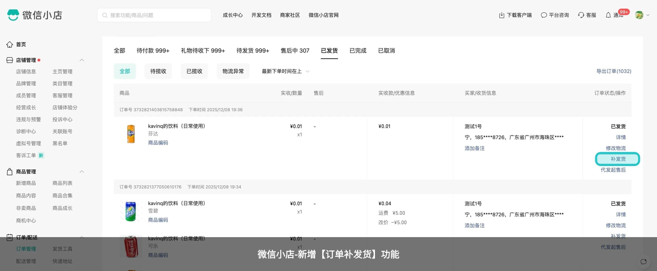 详细请查看:《微信小店「订单补发货」使用指引》