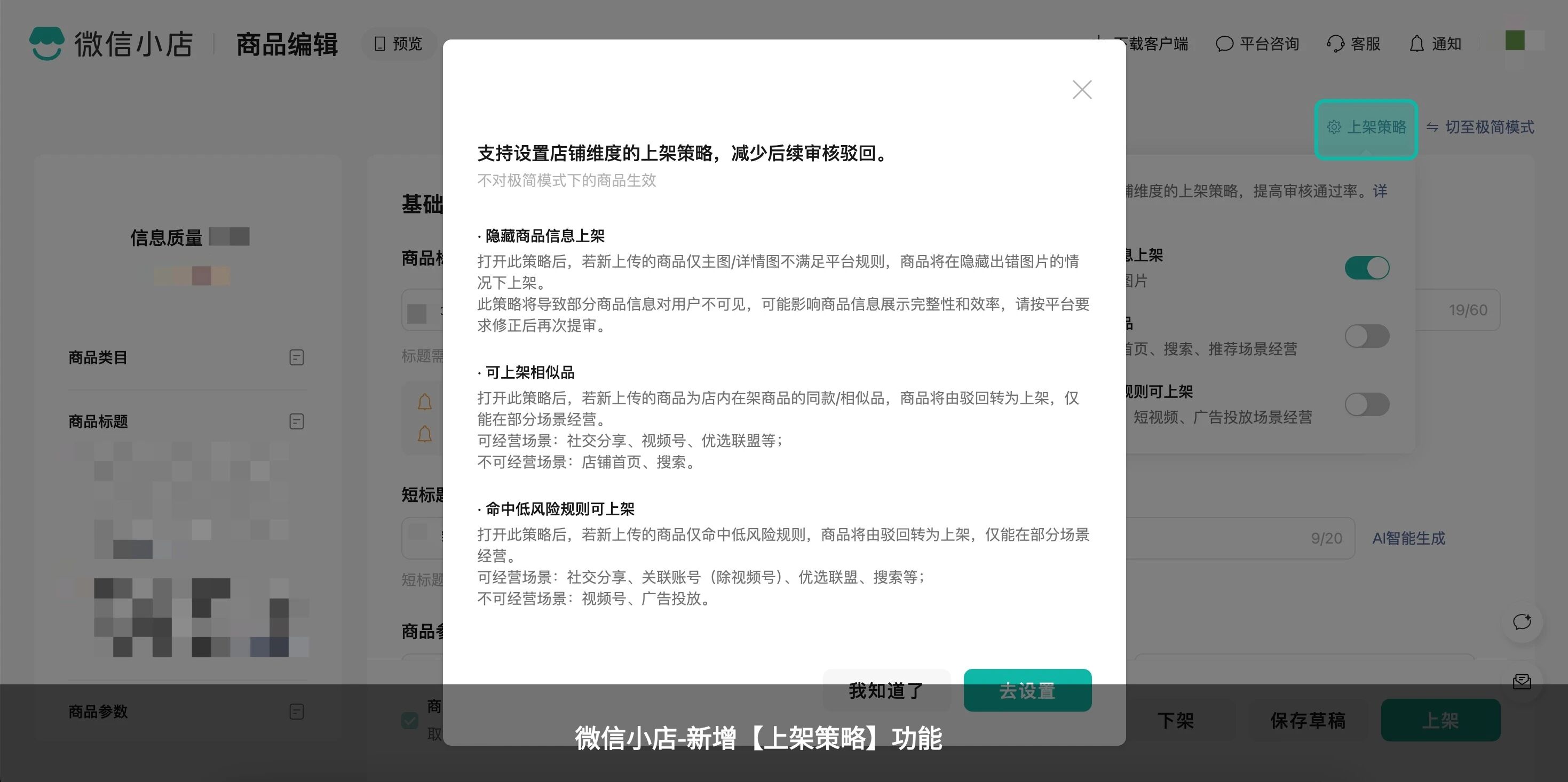功能简介:「商品发布-上架策略」功能是微信小店在商品发布环节的新增能力。