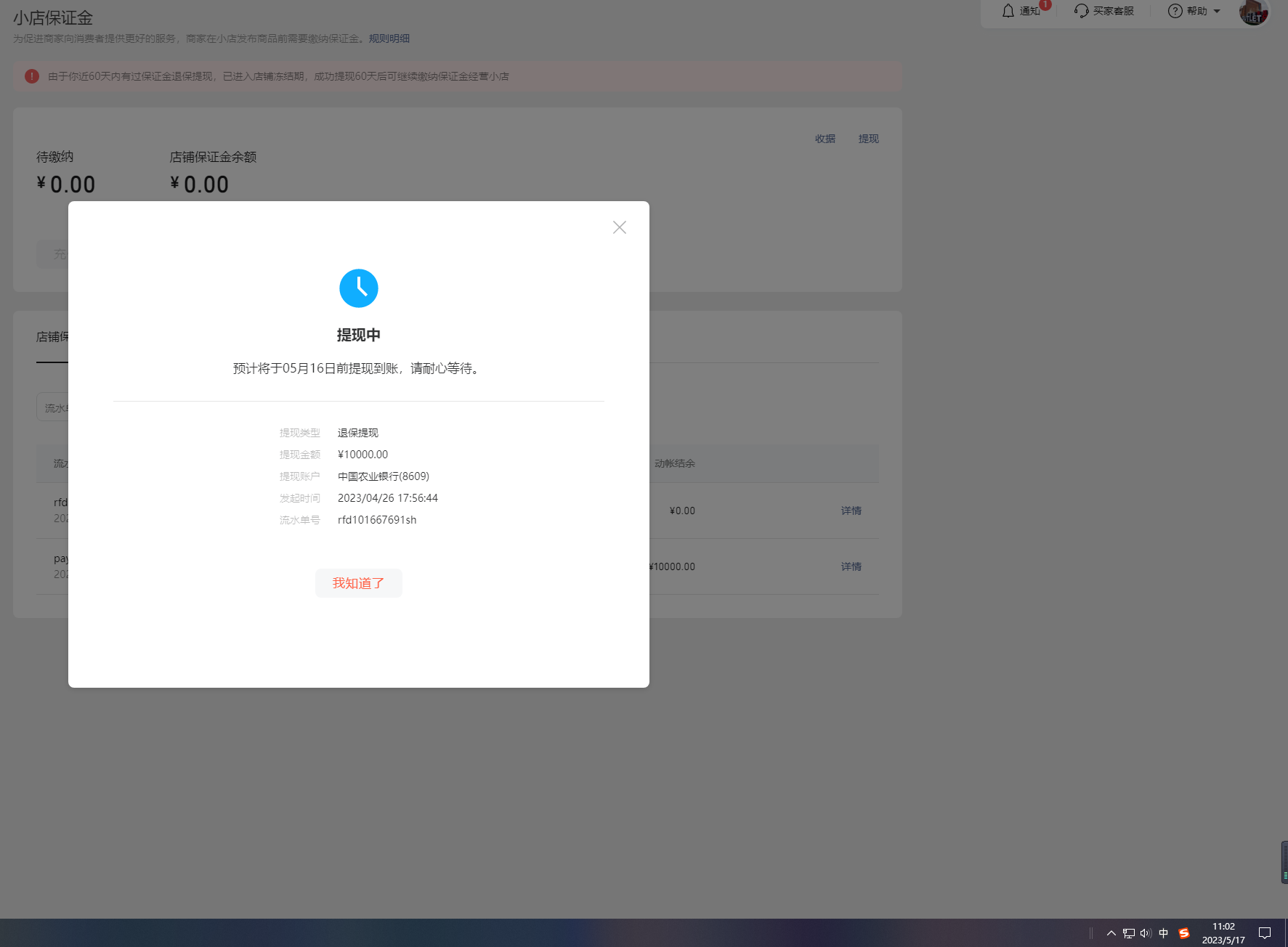 你好,根据你反馈的保证金问题,目前查询到你申请的小店保证金退保进度还在时效内,我们已积极协助推动,保证金的退保时效是15-20个工作日左右到账,请耐心等候到账。感谢你的理解与支持!