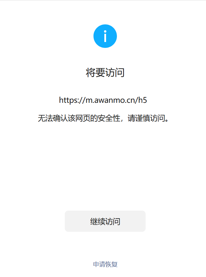 微信访问链接https://m.awanmo.cn/h5,提示无法确认该网页的安全性,请谨慎访问。确定域名ip没有违规内容,希望恢复下,网站备案截图如下,已经严重影响我们正常使用了