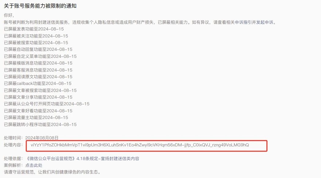 没有指明具体是文章内容、自定义菜单、资料等具体功能违规,申诉后也回复只说违规了