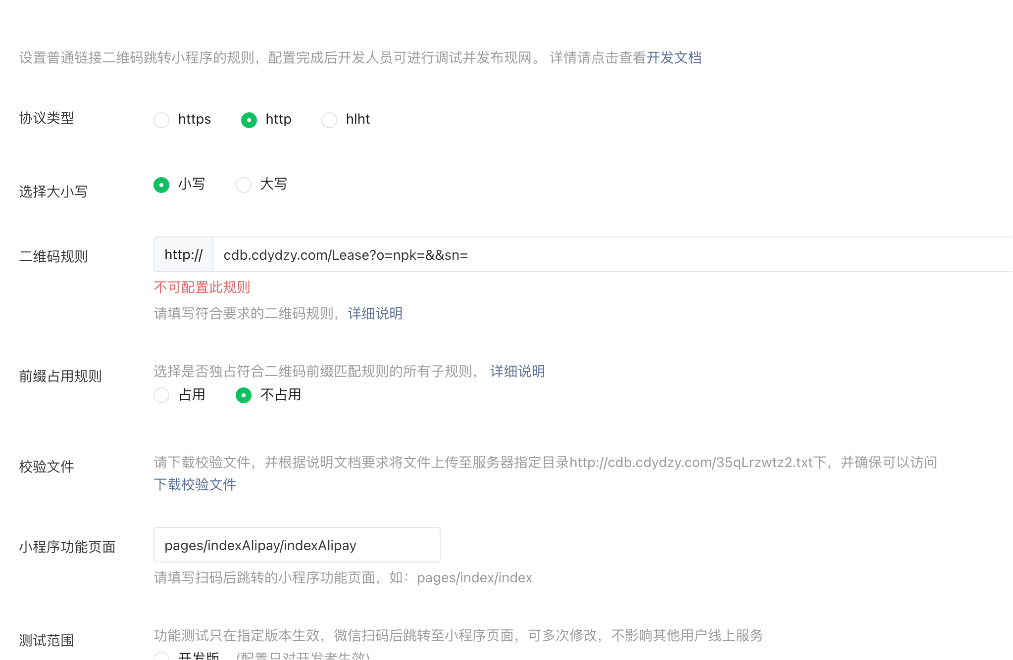 域名是通过备案的,二维码规则也没什么问题。就是现实无法配置