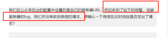 我们在公众号后台的配置中设置的是自己的服务器URL,然后收到了如下的报警,观察服务器的log,我们并没有收到微信的请求,想确认一下微信在此时间段是否发出了请求?