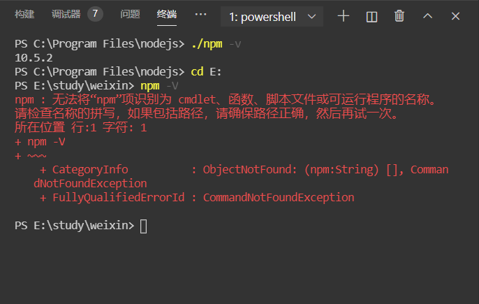 当使用内建终端,使用npm命令时,发现内建的终端无法识别windows系统的系统变量,在powershell里可以正常使用。