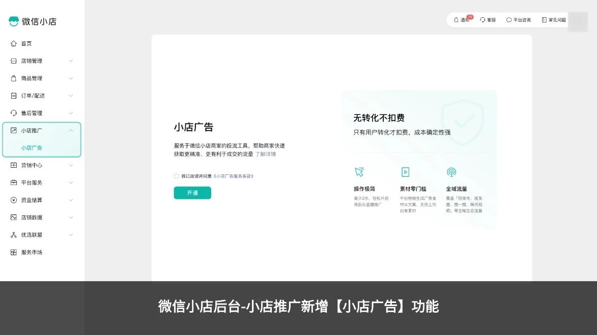 功能简介:商家可在微信小店后台一键开通,高效转化商品或直播间。