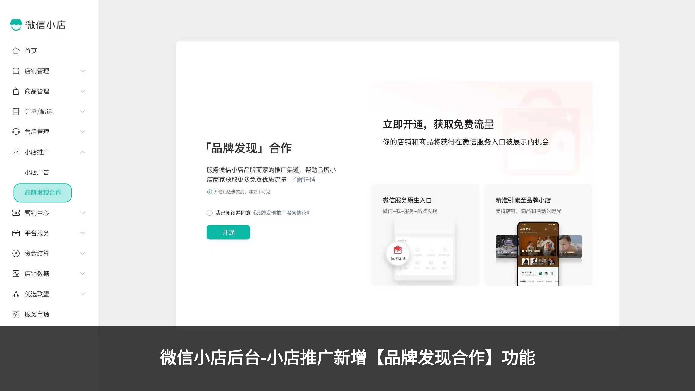 功能简介:热招品牌(查询地址:微信小店-热招品牌查询)店铺超级管理员一键开通,授权平台在特定场景和期限内推广指定的商品。