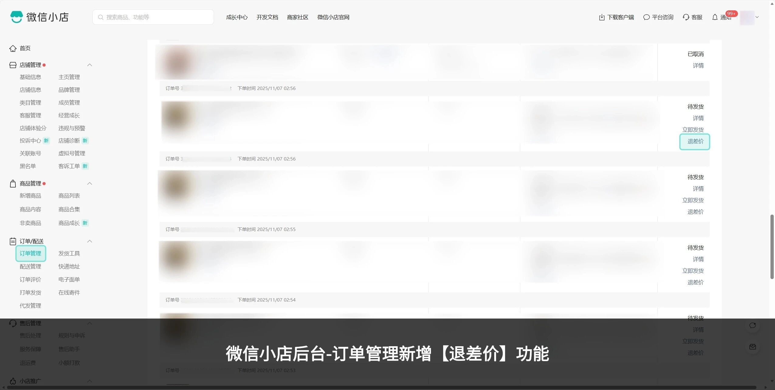 功能简介:商家因商品降价、营销活动导致价格波动等原因需要向用户退差价时,可通过此功能直接向用户发起退差价申请。