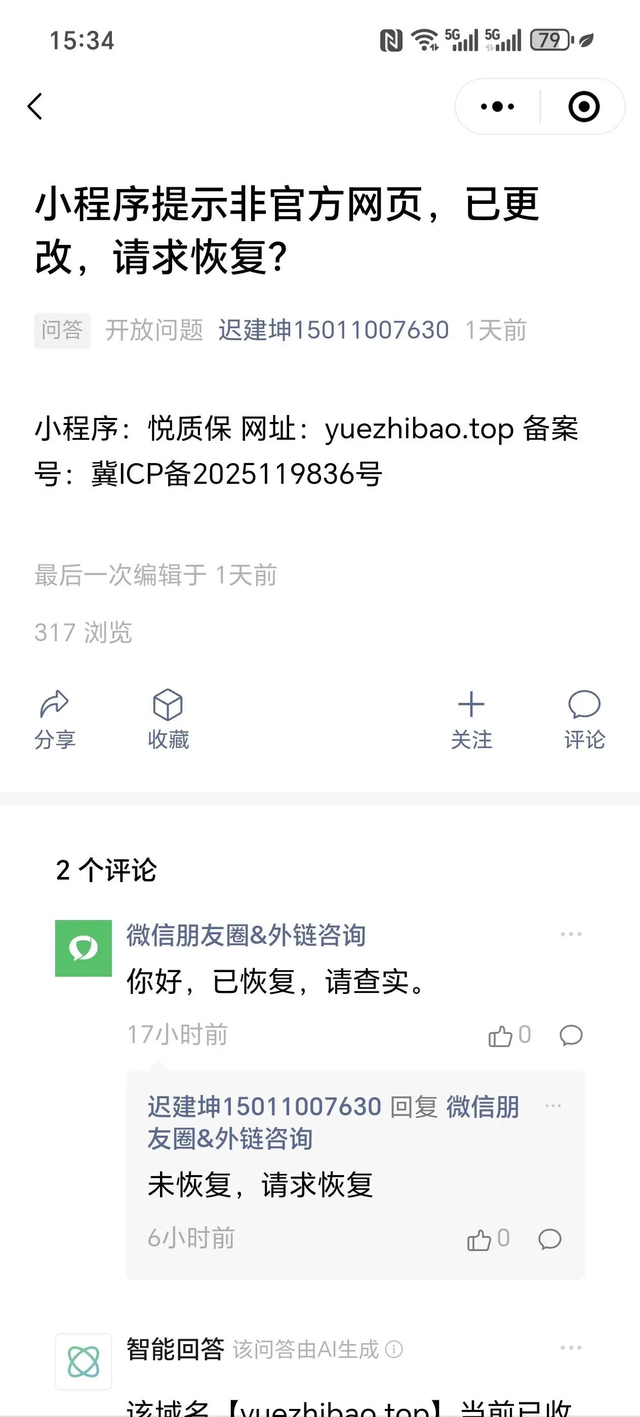 小程序:悦质保 网址:yuezhibao.top 备案号:冀ICP备2025119836号 之前提问说已恢复,但实际并未恢复