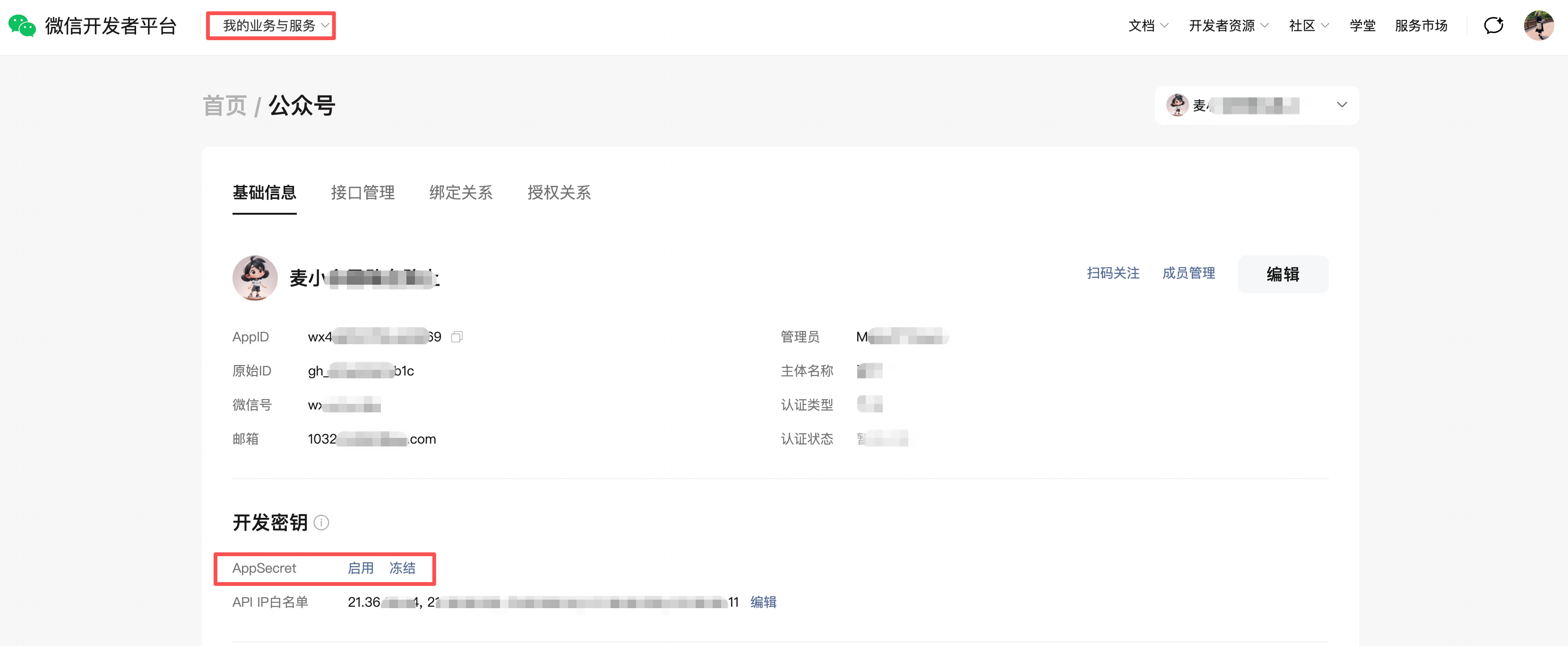 1、如果你已经是公众号的开发者或者管理员,可以直接访问开发者平台 - 顶部导航栏的我的业务与服务 - 公众号,如下图