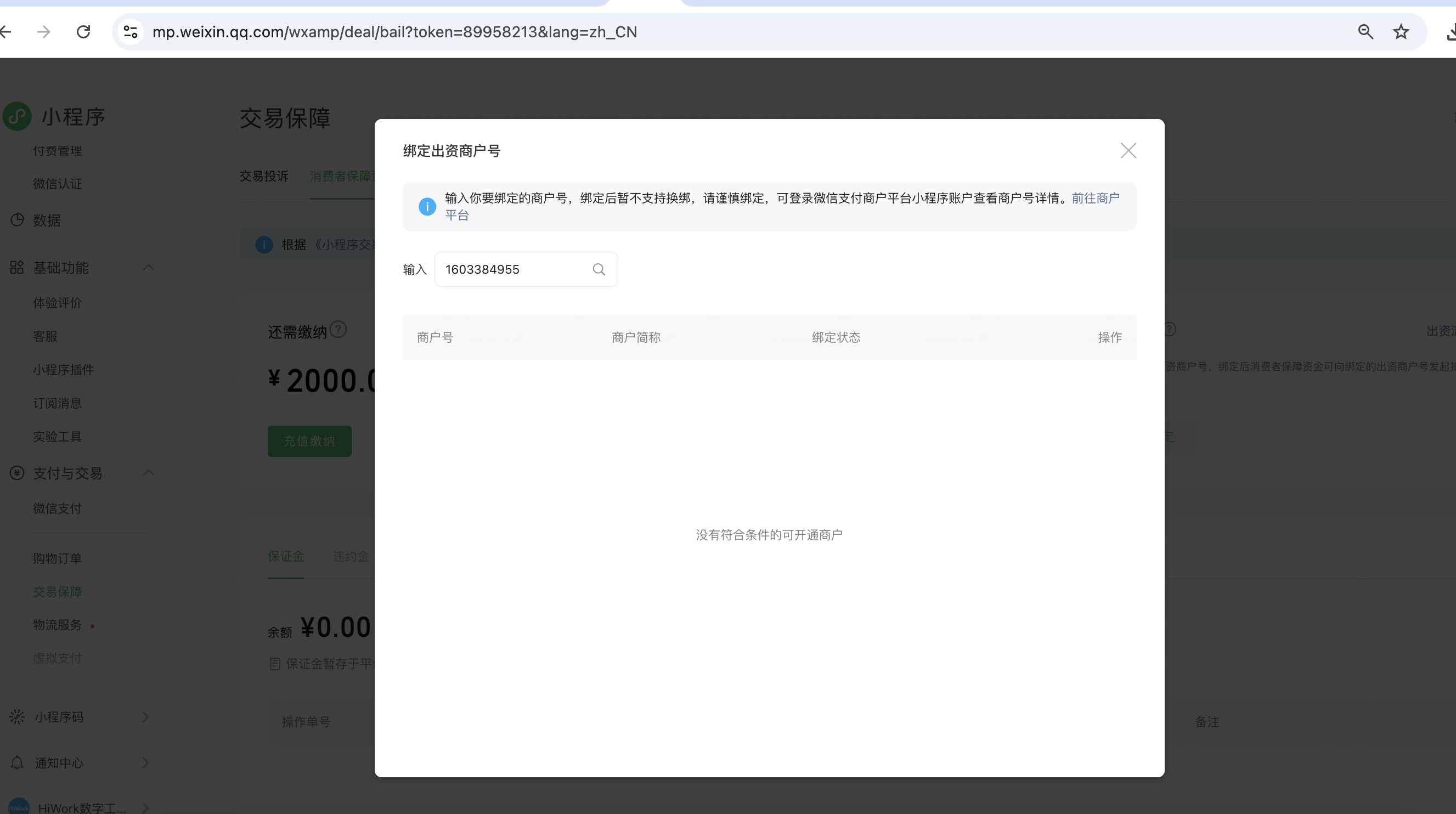 众合云科信息技术集团有限公司这个主体的小程序要缴纳保证金,需绑定出资商户号,绑定过程中提示没有符合条件可开通商户号,想绑定1603384955(主体:海南众合天下科技有限公司)这个主体的商户号进行缴纳,要如何操作呢?
