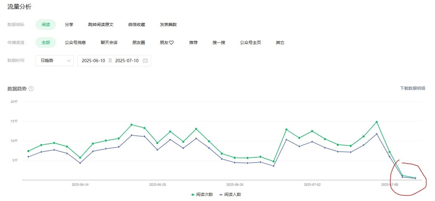 如图所示,从7/9日开始至今阅读量骤然暴跌,没有任何违规情况,明显限流