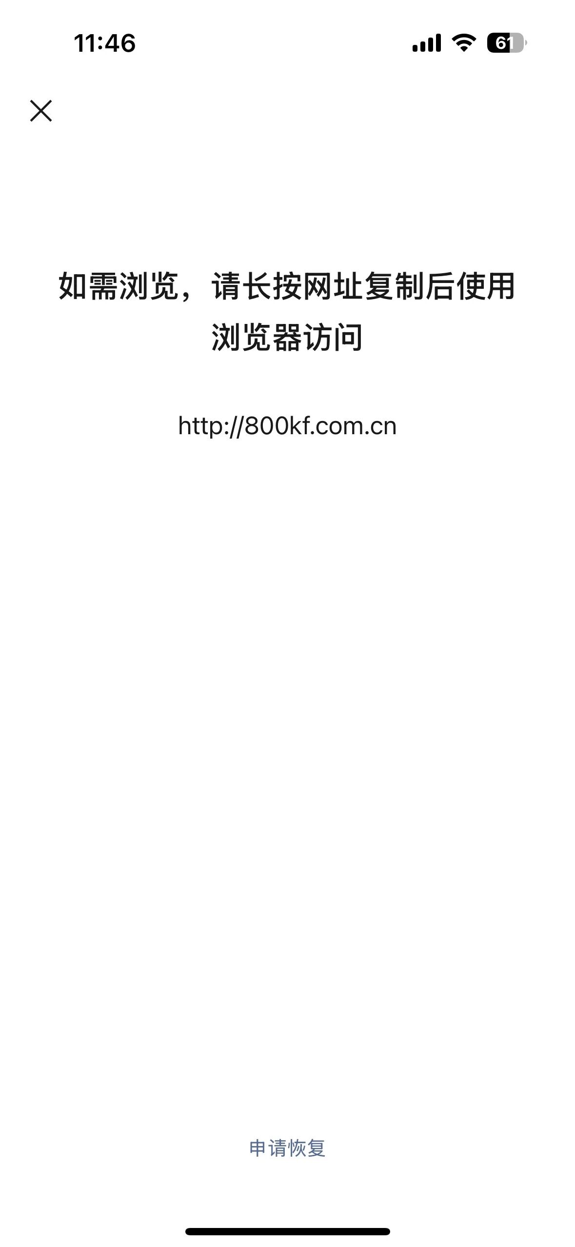 你好,经核实域名 800kf.com.cn 下的链接违反了《微信外部链接内容管理规范》,我们无法恢复微信内直接访问的服务,请知悉。《微信外部链接内容管理规范》的具体内容可访问 http://weixin.qq.com/cgi-bin/readtemplate?t=weixin_external_links_content_management_specification